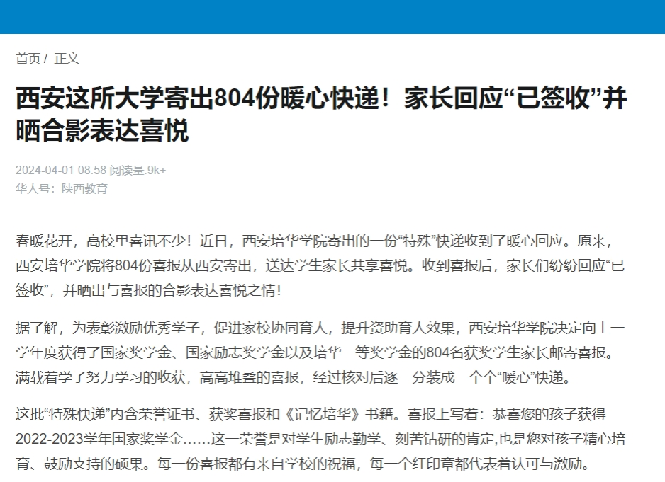 春暖花开,高校里喜讯不少!近日,西安培华学院寄出的一份“特殊”快递收到了暖心回应。原来,西安培华学院将804份喜报从西安寄出,送达学生家长共享喜悦。收到喜报后,家长们纷纷回应“已签收”,并晒出与喜报的合影表达喜悦之情!