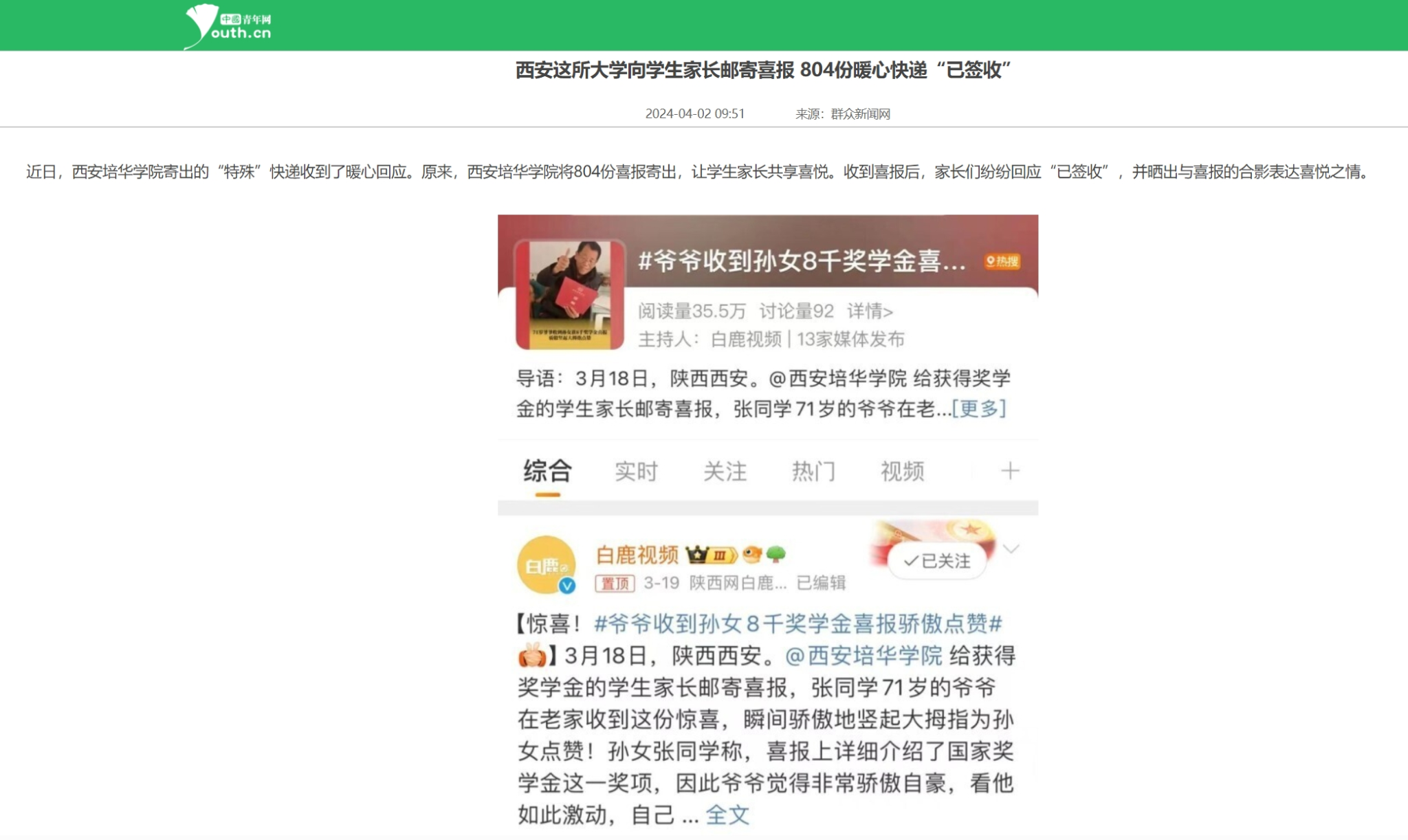 近日,西安培华学院寄出的“特殊”快递收到了暖心回应。原来,西安培华学院将804份喜报寄出,让学生家长共享喜悦。收到喜报后,家长们纷纷回应“已签收”,并晒出与喜报的合影表达喜悦之情。