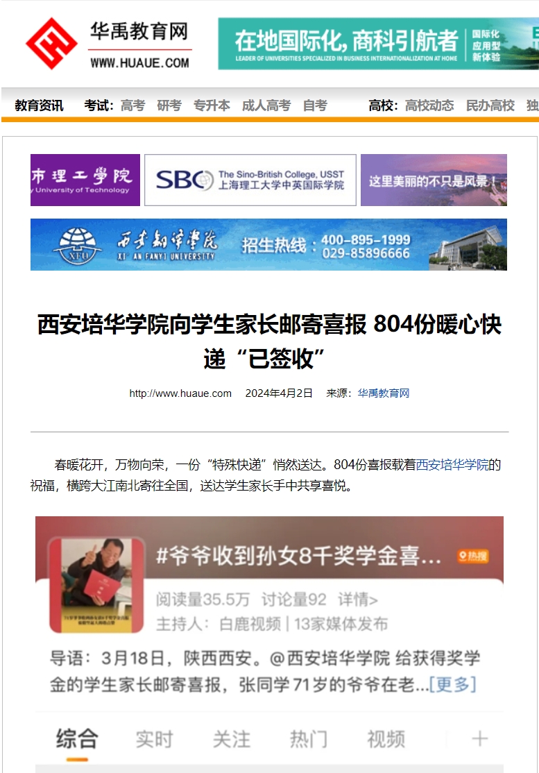 华禹教育网:西安培华学院向学生家长邮寄喜报 804份暖心快递“已签收”