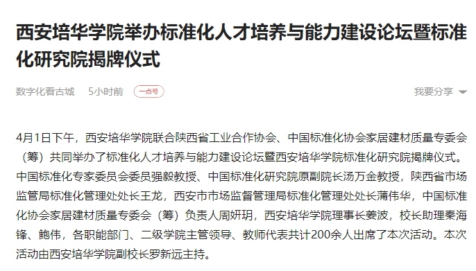 一点资讯:西安培华学院举办标准化人才培养与能力建设论坛暨标准化研究院揭牌仪式