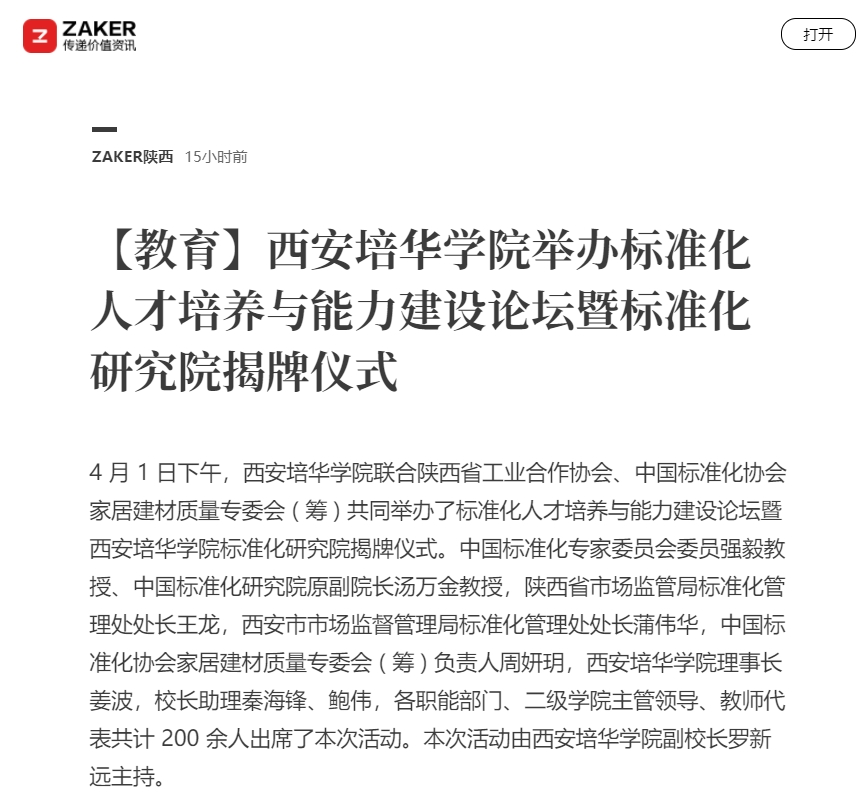 ZAKER:【教育】西安培华学院举办标准化人才培养与能力建设论坛暨标准化研究院揭牌仪式