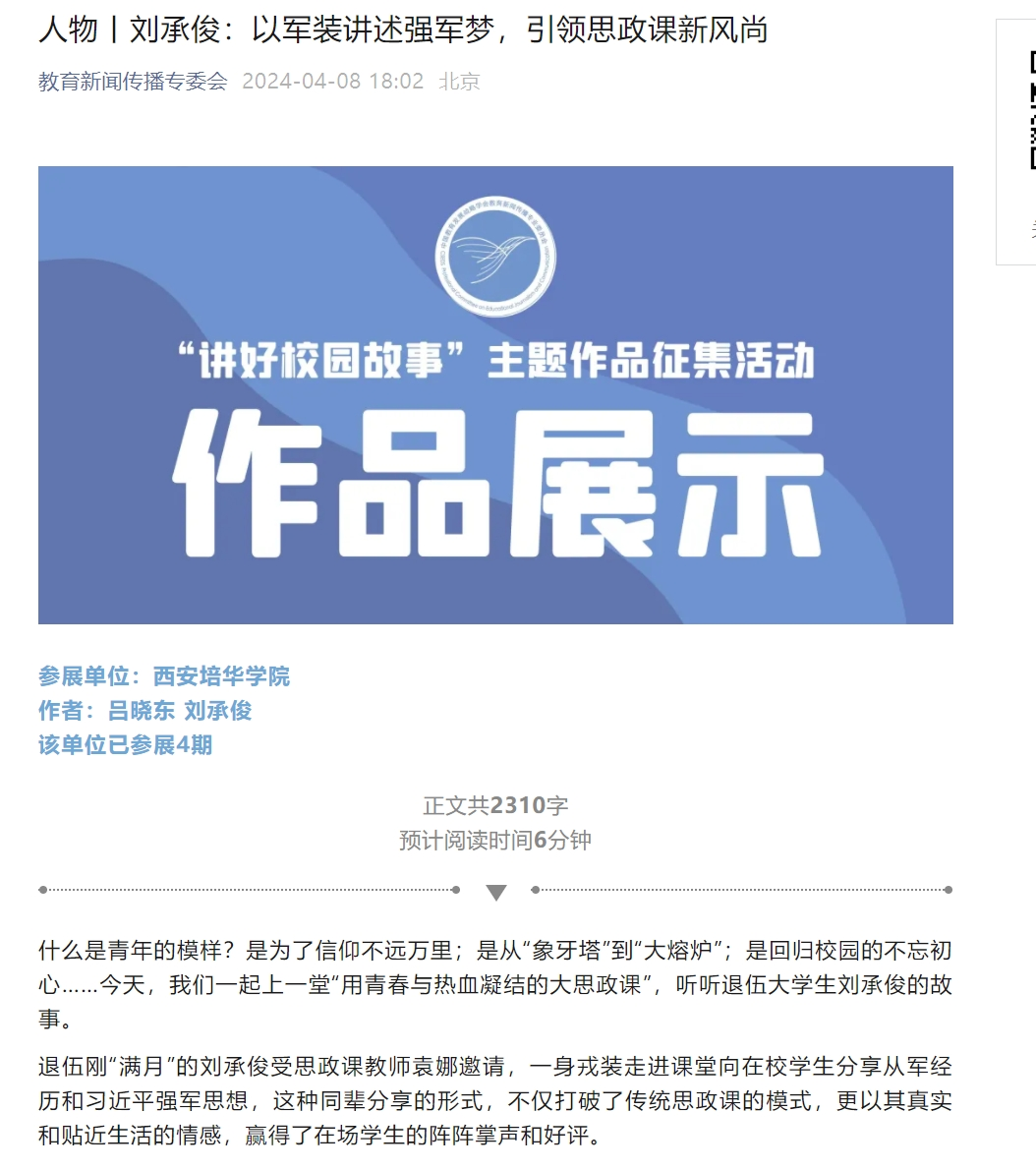 退伍刚“满月”的刘承俊受思政课教师袁娜邀请,一身戎装走进课堂向在校学生分享从军经历和习近平强军思想,这种同辈分享的形式,不仅打破了传统思政课的模式,更以其真实和贴近生活的情感,赢得了在场学生的阵阵掌声和好评。