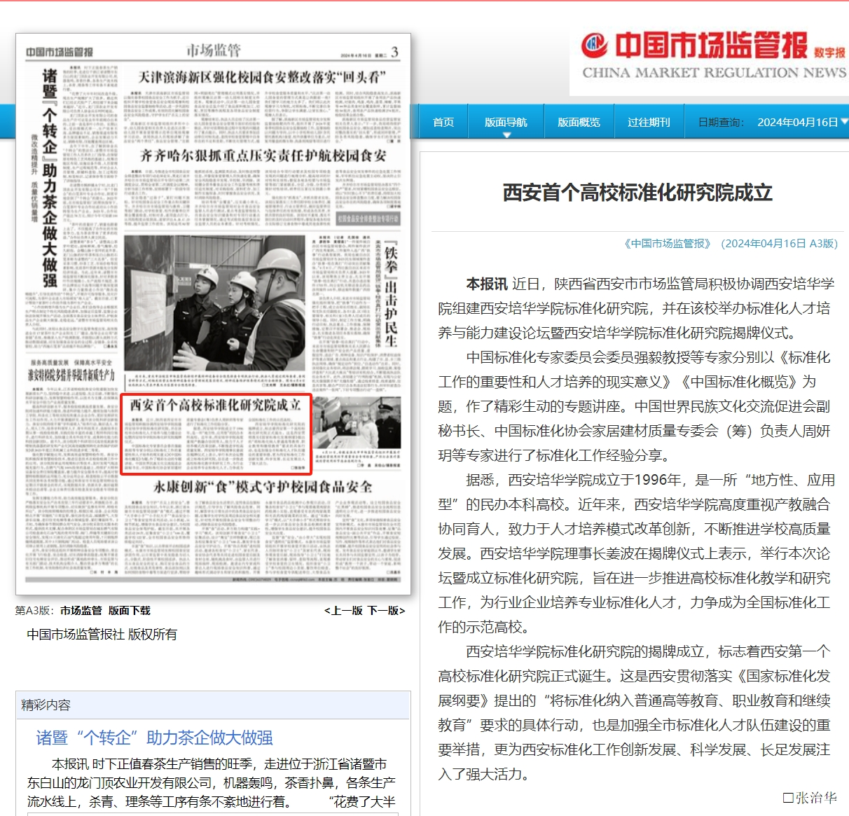 近日,陕西省西安市市场监管局积极协调西安培华学院组建西安培华学院标准化研究院,并在该校举办标准化人才培养与能力建设论坛暨西安培华学院标准化研究院揭牌仪式。