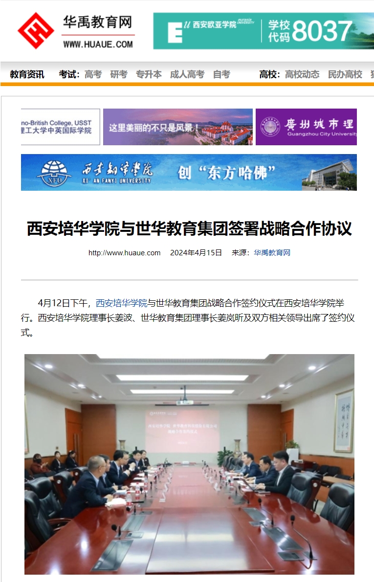 4月12日下午,西安培华学院与世华教育集团战略合作签约仪式在西安培华学院举行。西安培华学院理事长姜波、世华教育集团理事长姜岚昕及双方相关领导出席了签约仪式。