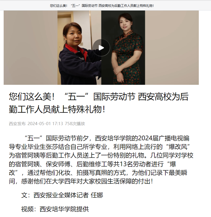 “五一”国际劳动节前夕,西安培华学院的2024届广播电视编导专业毕业生张莎结合自己所学专业,利用网络上流行的“爆改风”为宿管阿姨等后勤工作人员送上了一份特别的礼物。几位同学对学校的宿管阿姨、保安师傅、后勤维修工等共13名劳动者进行“爆改”,通过帮他们化妆、拍摄写真照的方式,为他们记录下最美瞬间,感谢他们在大学四年对大家校园生活保障的付出!
