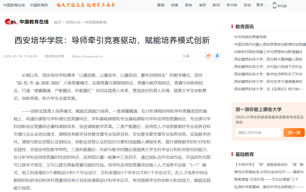 长期以来,西安培华学院秉承“以赛促教、以赛促学、以赛促训、赛学训相结合”的教学模式,坚持“院-校-市-省-国家-国际”六级竞赛模式,实施竞赛与课程相结合、竞赛与教改相结合、竞赛与创新相结合,打通“课赛融通、产教融合、科教融汇”协同实践育人体系,营造良好的育人环境,提高大学生创新意识、创新思维,助力学生全面发展。