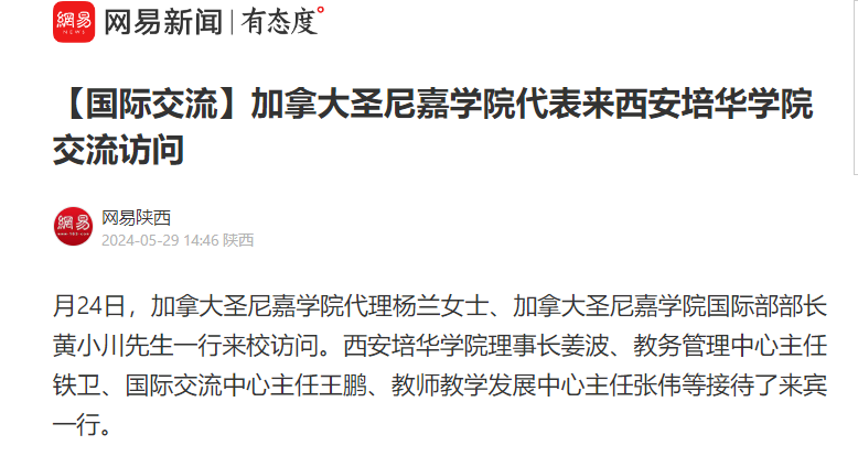 网易新闻:加拿大圣尼嘉学院代表来西安培华学院交流访问