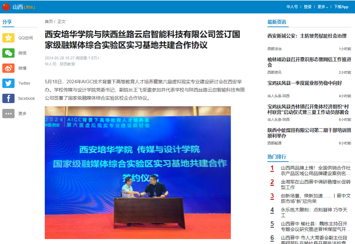 5月18日,2024年AIGC技术背景下高等教育人才培养暨第六届虚拟现实专业建设研讨会在西安举办。学校传媒与设计学院党委书记、副院长王飞受邀参加并代表学校与陕西丝路云启智能科技有限公司签署了国家级融媒体综合实验区校企合作协议。