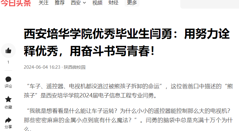 今日头条:西安培华学院优秀毕业生闫勇:用努力诠释优秀,用奋斗书写青春!