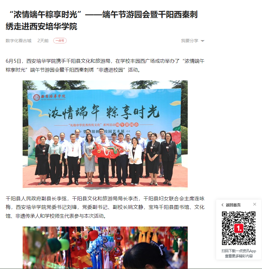 6月5日,西安培华学院携手千阳县文化和旅游局,在学校丰园西广场成功举办了“浓情端午粽享时光”端午节游园会暨千阳西秦刺绣“非遗进校园”活动。