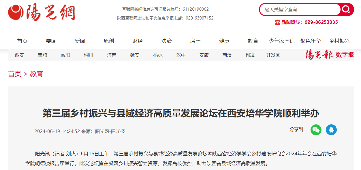 阳光网:第三届乡村振兴与县域经济高质量发展论坛在西安培华学院顺利举办