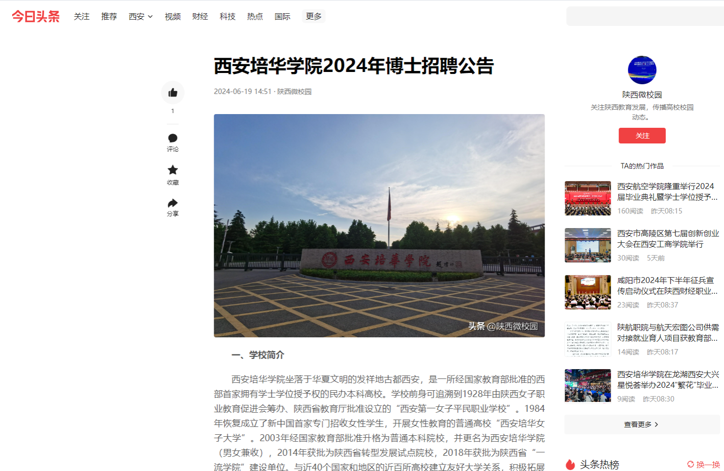 今日头条;西安培华学院2024年博士招聘公告