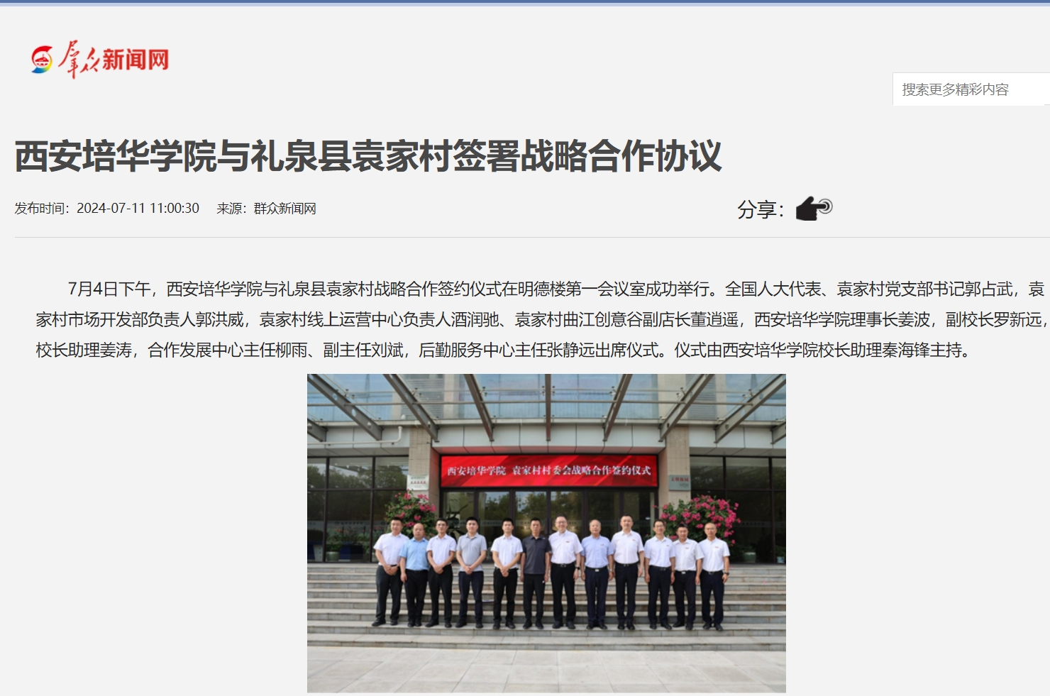 7月4日下午,西安培华学院与礼泉县袁家村战略合作签约仪式在明德楼第一会议室成功举行。全国人大代表、袁家村党支部书记郭占武,袁家村市场开发部负责人郭洪威,袁家村线上运营中心负责人酒润驰、袁家村曲江创意谷副店长董逍遥,西安培华学院理事长姜波,副校长罗新远,校长助理姜涛,合作发展中心主任柳雨、副主任刘斌,后勤服务中心主任张静远出席仪式。仪式由西安培华学院校长助理秦海锋主持。