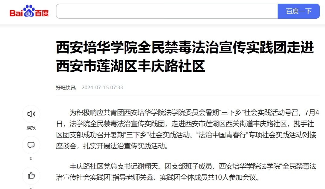 为积极响应共青团西安培华学院法学院委员会暑期“三下乡”社会实践活动号召,7月4日,法学院全民禁毒法治宣传实践团,走进西安市莲湖区西关街道丰庆路社区,携手社区团支部成功召开暑期“三下乡”社会实践活动、“法治中国青春行”专项社会实践活动对接座谈会,扎实开展法治宣传实践活动。