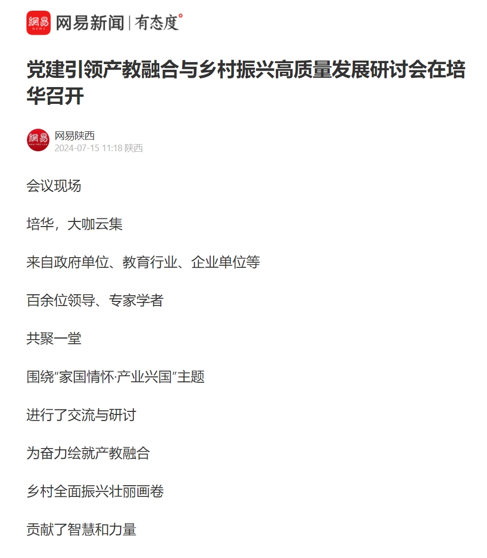 为深入贯彻落实党中央、国务院关于深化职业教育体系建设和推进乡村振兴工作的战略部署,加强职业教育服务国家战略和区域经济社会发展能力,深化产教融合,助力乡村振兴。在全党全国喜迎党的二十届三中全会,以高质量发展奋力推进中国式现代化的伟大征程中,由陕西省中华职业教育社、全国农村产业融合发展联盟、西安培华学院、活水教育集团主办的“家国情怀·产业兴国”党建引领产教融合与乡村振兴高质量发展研讨会7月13日上午在西安培华学院举行。