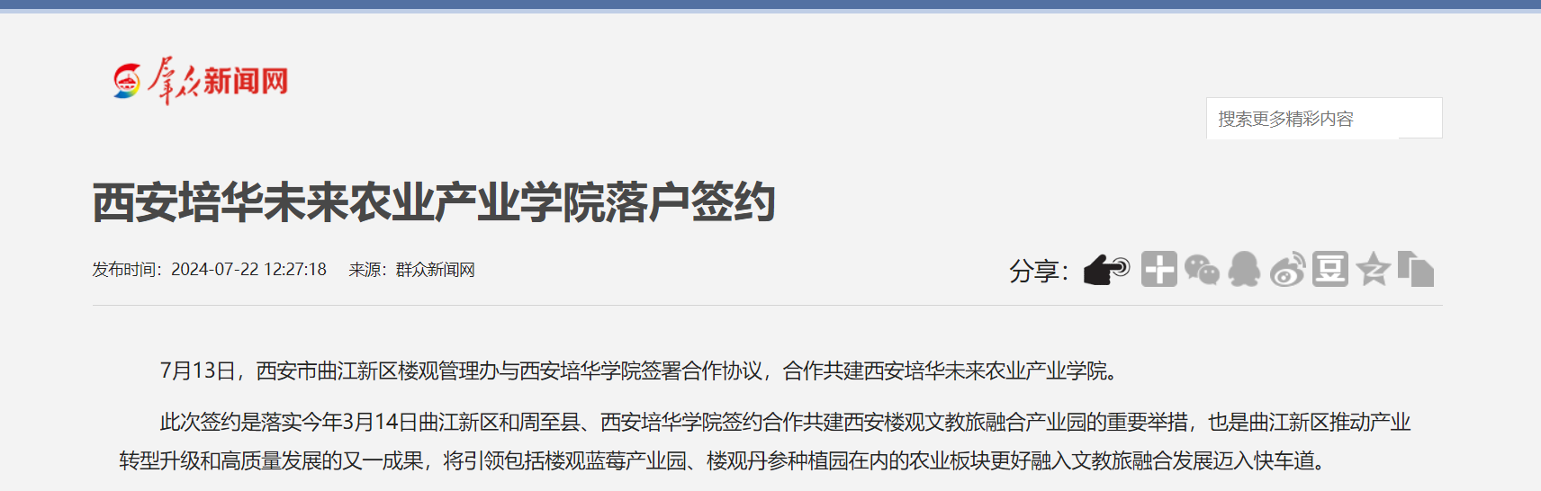 7月13日,曲江新区楼观管理办与西安培华学院签署合作协议,合作共建西安培华未来农业产业学院