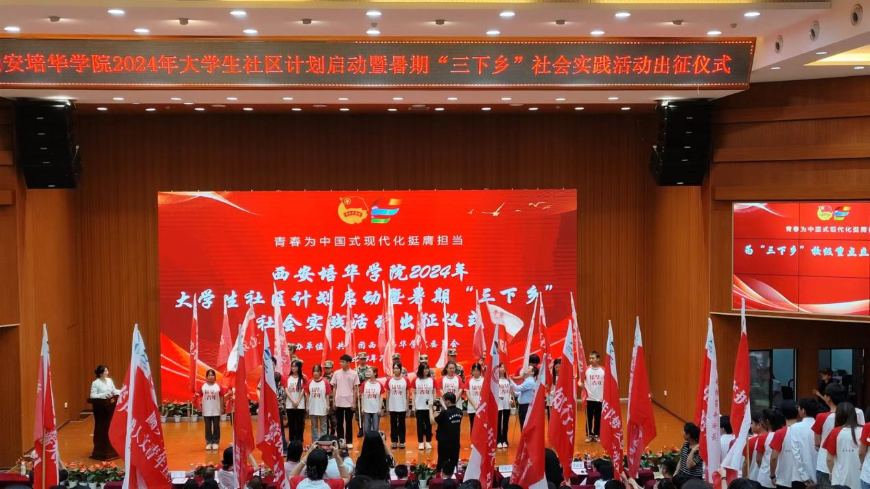 7月2日,在图书馆报告厅举行了 “西安培华学院”2024年大学生社区计划暨暑期"三下乡"社会实践活动出征仪式,会议进行了迎团旗、奏唱团歌,授旗仪式等活动,鲜艳的旗帜代表着每一支队伍的责任与担当,承担着每一位领导和老师的鼓励和支持,培华学子定会让手中的旗帜高高飘扬。