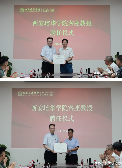 在客座教授聘任仪式环节,省决咨委民生组副组长、西安理工大学原党委书记刘德安教授,省决咨委委员、陕西省发改委原副主任王振海受聘为西安培华学院客座教授,姜波理事长向其颁发了客座教授聘书,并亲自佩戴校徽。