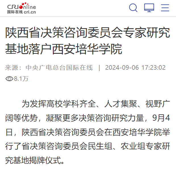 中央广电总台国际在线 :陕西省决策咨询委员会专家研究基地落户西安培华学院