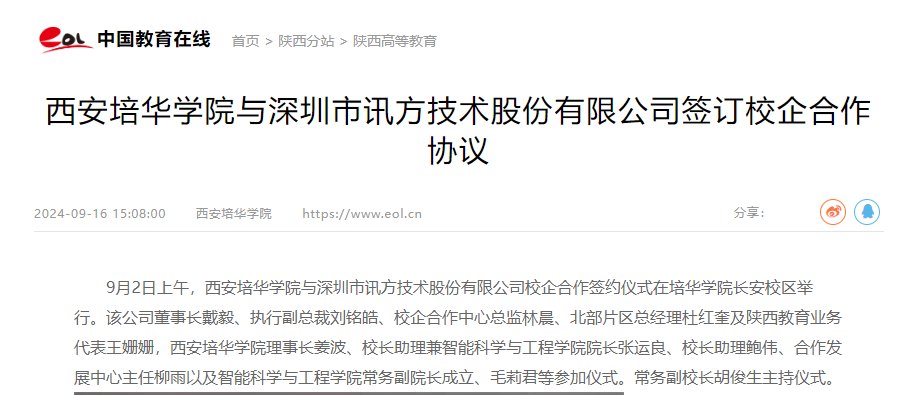 中国教育在线网:西安培华学院与深圳市讯方技术股份有限公司签订校企合作协议