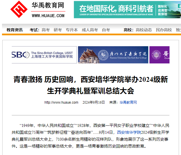 华禹教育网:青春激扬 历史回响,西安培华学院举办2024级新生开学典礼暨军训总结大会