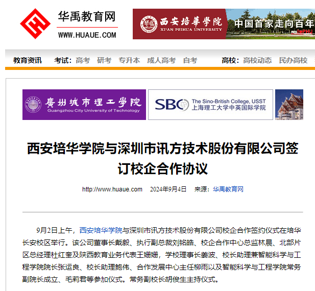 华禹教育网:西安培华学院与深圳市讯方技术股份有限公司签订校企合作协议