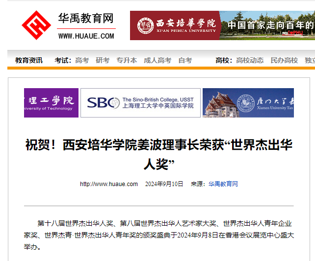 华禹教育网:祝贺!西安培华学院姜波理事长荣获“世界杰出华人奖”