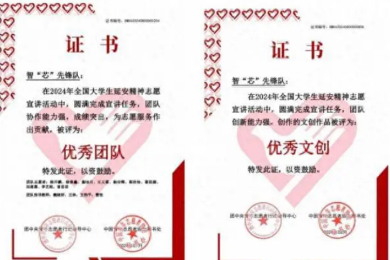 近日,团中央青年志愿者行动指导中心、中共延安市委、共青团贵州省委联合举办的2024年全国大学生延安会议宣讲团项目发布了全国优秀团队评选结果,西安培华学院智“芯”先锋队圆满完成任务,在全国1000支队伍中脱颖而出,荣获2024年全国大学生延安精神志愿宣讲“优秀团队”“优秀文创”称号,杨开鹏、童怡月等10名团队成员荣获表彰。