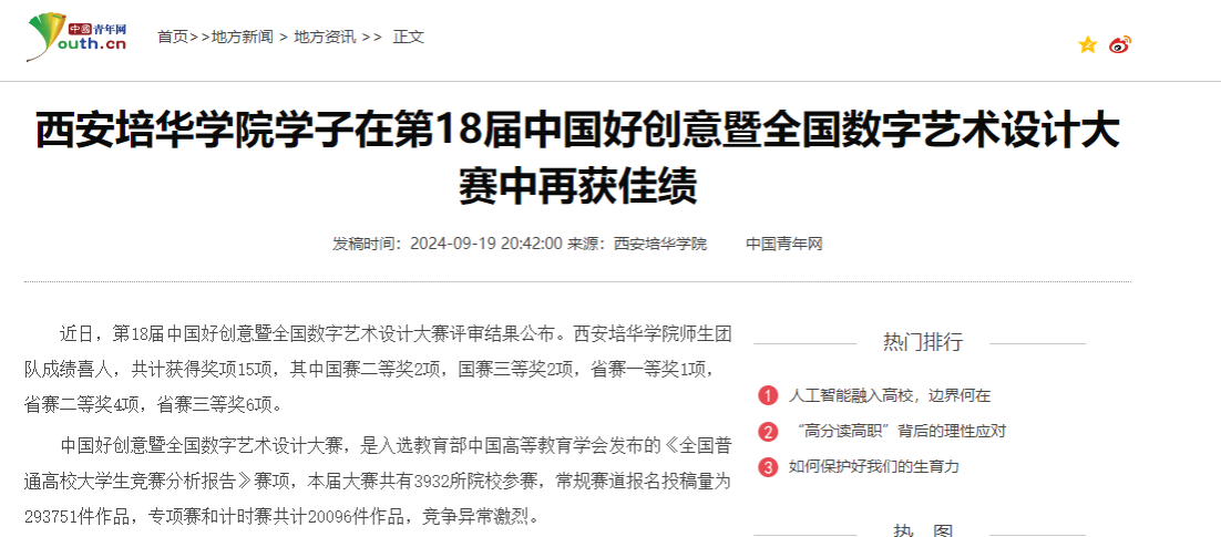 近日,第18届中国好创意暨全国数字艺术设计大赛评审结果公布。西安培华学院师生团队成绩喜人,共计获得奖项15项,其中国赛二等奖2项,国赛三等奖2项,省赛一等奖1项,省赛二等奖4项,省赛三等奖6项。