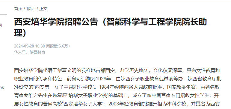 华人号:西安培华学院招聘公告(智能科学与工程学院院长助理)