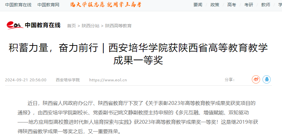 教育教学成果奖是陕西省高等教育教学领域的最高奖项,是对学校人才培养工作和教育教学改革成果的检阅和展示,本次获奖是在学校理事会和学校党政的坚强领导下,取得的成绩凝聚了学校教师在教育教学工作实践中的不懈探索和拼搏奋斗,这不仅标志着学校在应用型人才培养上的深入探索取得显著成效,也进一步彰显了其在培养时代新人、推动高质量发展方面的坚定决心与孜孜追求。