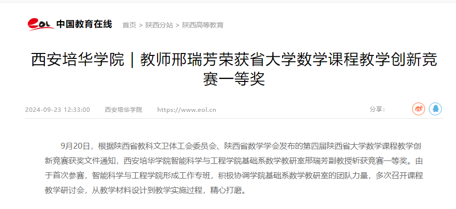中国教育在线:西安培华学院 | 教师邢瑞芳荣获省大学数学课程教学创新竞赛一等奖