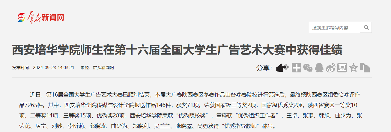 群众新闻网:西安培华学院师生在第十六届全国大学生广告艺术大赛中获得佳绩