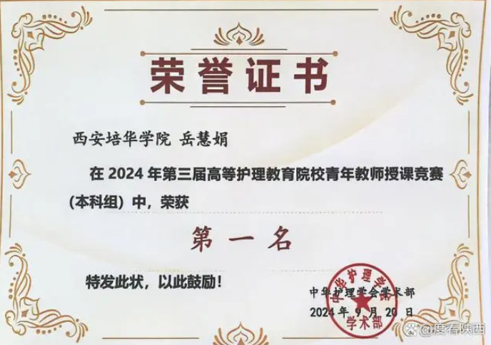 学校医学院护理系岳慧娟副教授作为2021年陕西省青年护理教师教学大赛一等奖获得者,与省内其他5所本科院校的5位老师被陕西省护理学会选送参加此次比赛。最终,岳慧娟老师以卓越表现,力压群雄,荣获本科组第一名,成为陕西省唯一一位荣获此殊荣的佼佼者,为我校赢得了无上的荣光。
