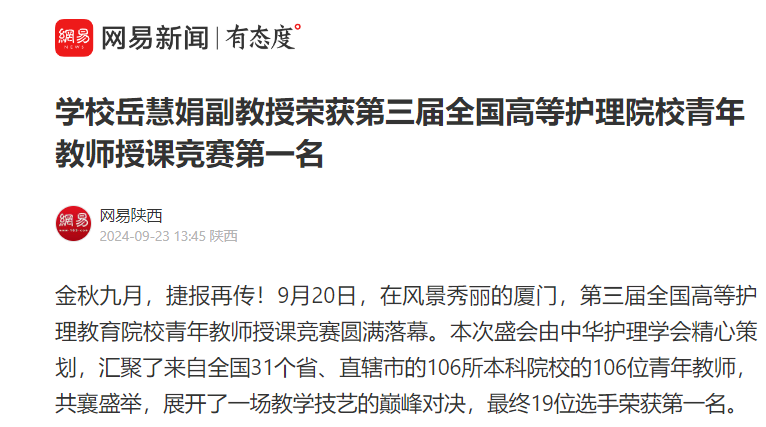 网易:学校岳慧娟副教授荣获第三届全国高等护理院校青年教师授课竞赛第一名
