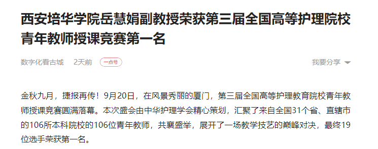 一点号:西安培华学院岳慧娟副教授荣获第三届全国高等护理院校青年教师授课竞赛第一名