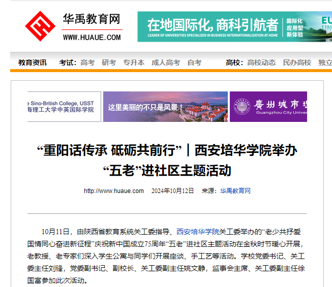 10月11日,由陕西省教育系统关工委指导、西安培华学院关工委举办的“五老”进社区主题活动在金秋时节暖心开展,老教授、老专家们深入学生公寓与同学们开展座谈、手工艺等活动。校党委书记、关工委主任刘锋,党委副书记、副校长、关工委副主任姚文静,监事会主席、关工委副主任徐国富参加此次活动。