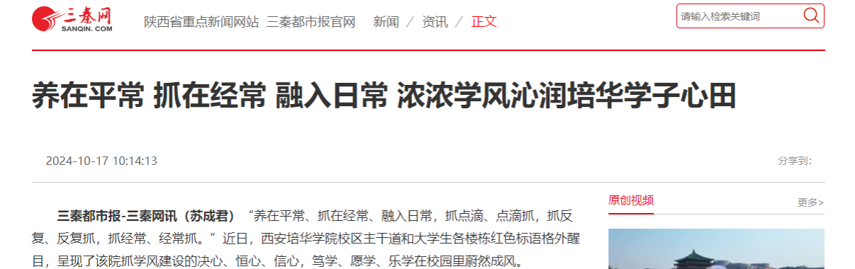 “养在平常、抓在经常、融入日常,抓点滴、点滴抓,抓反复、反复抓,抓经常、经常抓。”近日,西安培华学院校区主干道和大学生各楼栋红色标语格外醒目,呈现了该院抓学风建设的决心、恒心、信心,笃学、愿学、乐学在校园里蔚然成风。