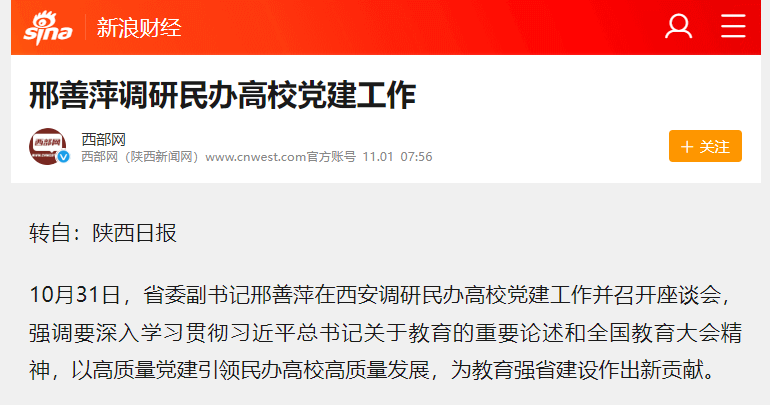 10月31日,省委副书记邢善萍在西安调研民办高校党建工作并召开座谈会,强调要深入学习贯彻习近平总书记关于教育的重要论述和全国教育大会精神,以高质量党建引领民办高校高质量发展,为教育强省建设作出新贡献。