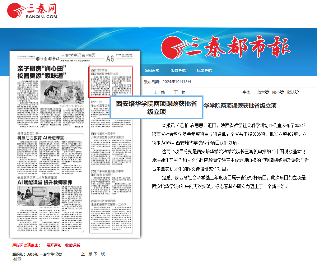 这两个项目分别是西安培华学院法学院院长王鸿貌申报的“中国税收基本制度法律化研究”和人文与国际教育学院王中俊老师申报的“明清耕织图及诗歌与近古中国农耕文化的图文传播研究”项目。