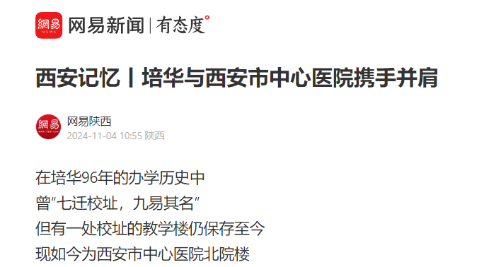 在培华96年的办学历史中,曾“七迁校址,九易其名”,但有一处校址的教学楼仍保存至今,现如今为西安市中心医院北院楼,这座具有72年历史的老教学楼。