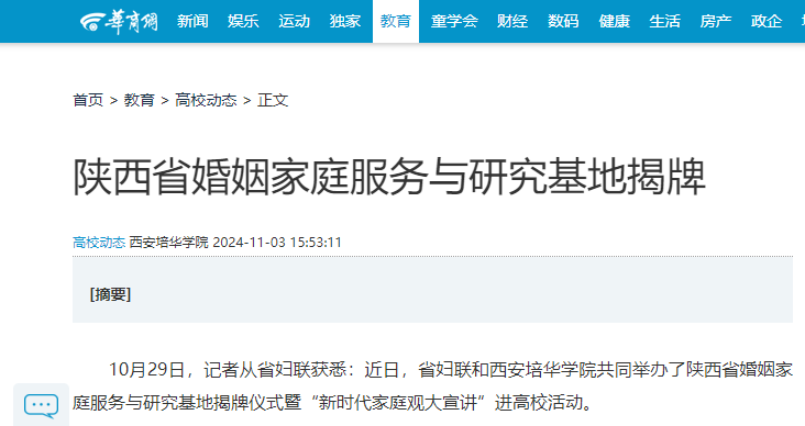 10月29日,记者从省妇联获悉:近日,省妇联和西安培华学院共同举办了陕西省婚姻家庭服务与研究基地揭牌仪式暨“新时代家庭观大宣讲”进高校活动。