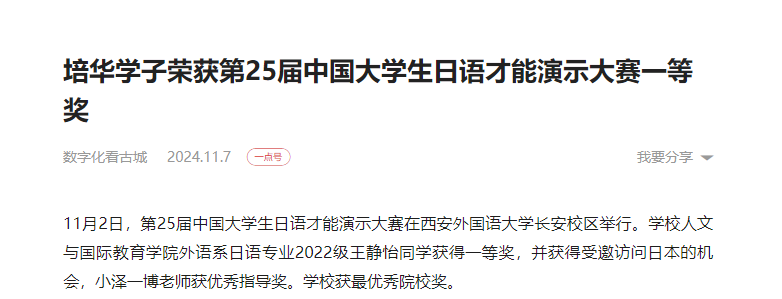11月2日,第25届中国大学生日语才能演示大赛在西安外国语大学长安校区举行。西安培华学院人文与国际教育学院外语系日语专业2022级王静怡同学获得一等奖,并获得受邀访问日本的机会,小泽一博老师获优秀指导奖。西安培华学院获最优秀院校奖。