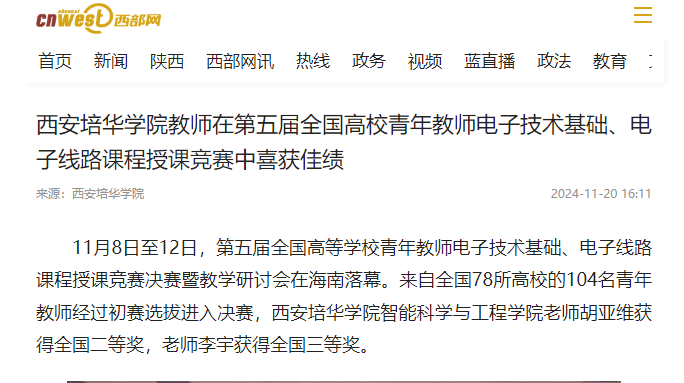 西部网:西安培华学院教师在第五届全国高校青年教师电子技术基础、电子线路课程授课竞赛中喜获佳绩