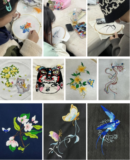 西秦刺绣,作为陕西省宝鸡地区的民间刺绣艺术,以其独特的艺术风格和精湛的手工技艺,成为了中国传统文化的瑰宝。王老师以其多元的知识和丰富的经验,为同学们介绍西秦刺绣的历史发展、刺绣的基本针法和色彩搭配技巧。同学们们发挥创意,将传统刺绣技艺与现代图案设计相结合,探索着西秦刺绣在现代服装设计中的无限可能。