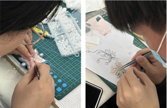 从了解盘扣的历史背景与文化意义,到观摩不同样式盘扣的结构与制作方法,从最初的简单尝试,到后来的熟练制作,同学们从非遗传承人马老师这里获得第一手的制作经验,并在实践中不断摸索,将传统技艺与自己的设计理念相融合,创造出了一系列既有传统韵味又符合现代审美的作品。