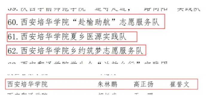 其中,西安培华学院荣获省级示范学校,学校“赴榆助航”志愿服务队、夏乡医源实践队、乡约筑梦志愿服务队荣获省级优秀团队,人文与国际教育学院老师朱林鹏、培华学子高正扬和崔誉文获省级先进个人。