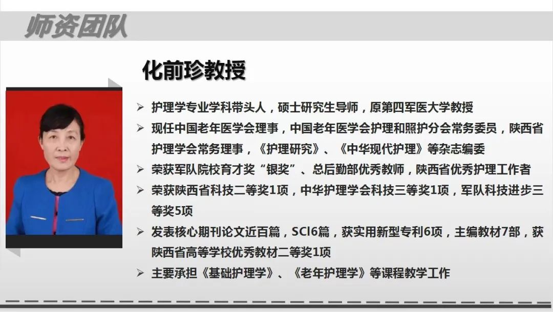 护理专业拥有一支学术水平高、结构合理的师资队伍,被评为校级教学团队,有国家级教学成果特等奖获得者、国家精品课程负责人、国家和省级学术组织常委、省级教学名师等。