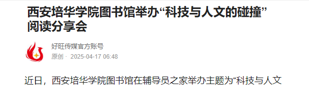 近日,西安培华学院图书馆在辅导员之家举办主题为“科技与人文的碰撞”阅读分享会。台阶文学社、图书馆学生管理委员会以及来自各学院的阅读爱好者30余人共同参与本次分享会,分享会由图管会服务部郑阳杰同学主持,带领大家开启了一场思想盛宴。