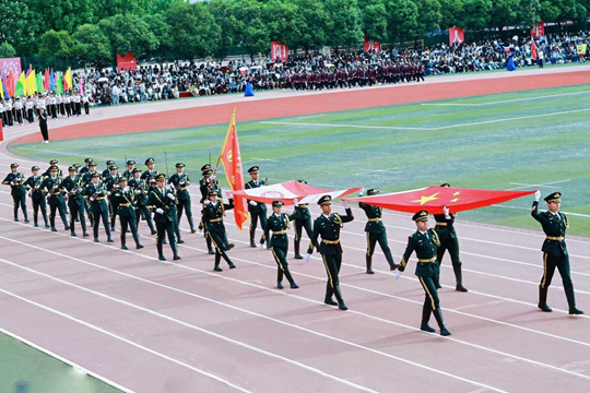 智能科学与工程学院学子执旗为剑,以钢铁之躯演绎精忠报国,红旗漫卷似燃烧的二进制烈焰。